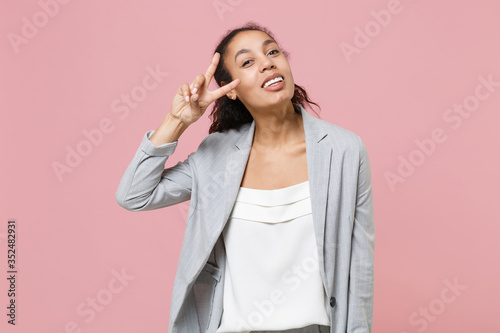 Smiling young african american business woman in grey suit white shirt posing isolated on pink background studio. Achievement career wealth business concept. Mock up copy space. Showing victory sign.