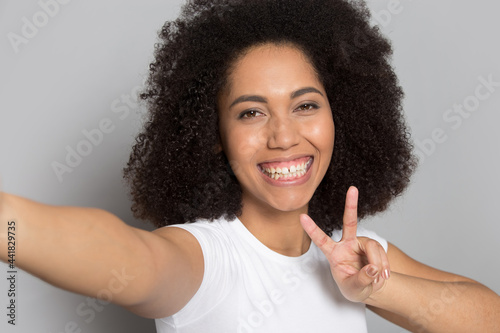 Smiling young African American woman isolated on grey studio background laugh make self-portrait picture on camera. Happy millennial mixed race female take selfie having fun. Diversity concept.