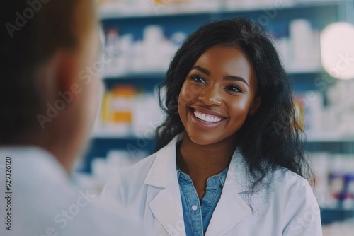 Smiling Young African Female Pharmacist in White Coat Consulting with Patient in Pharmacy