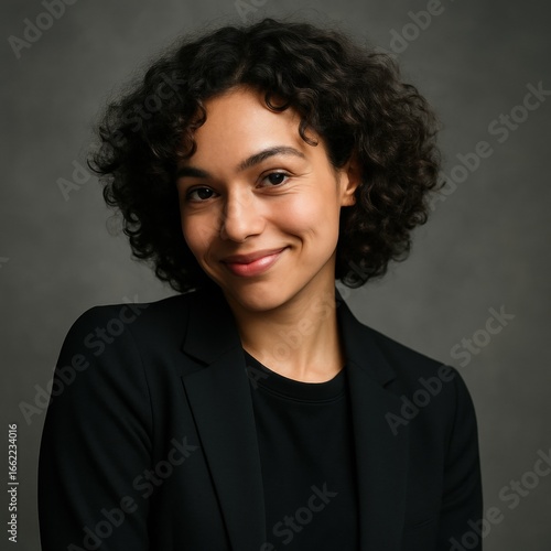 Smiling young african female with curly hair in black blazer against gray background
