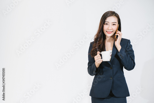 Smiling Young Asian business woman in black suit with long hair holding A cup of coffee and talking on the phone on white background,studio isolated.