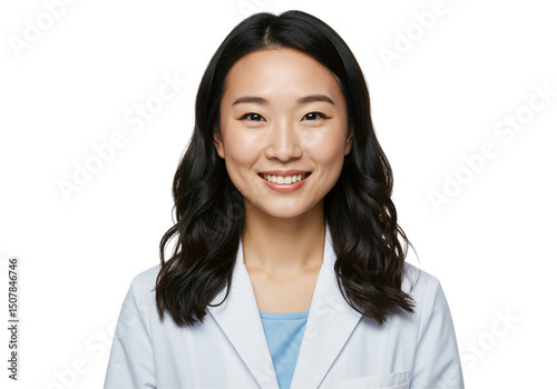 Smiling young Asian female doctor in a white lab coat looking at the camera. Portrait of a friendly healthcare professional on a transparent background.