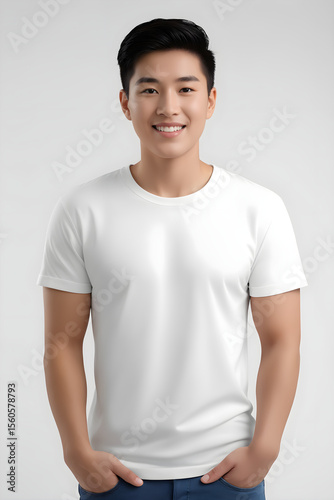 Smiling Young Asian Man Posing in Blank White T-shirt