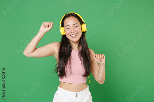 Smiling young asian woman girl in casual pink clothes isolated on green wall background studio portrait. People emotions lifestyle concept. Mock up copy space. Listening music with headphones dancing.
