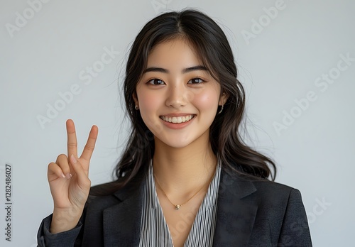 Smiling Young Asian Woman in Business Suit Showing Peace Sign