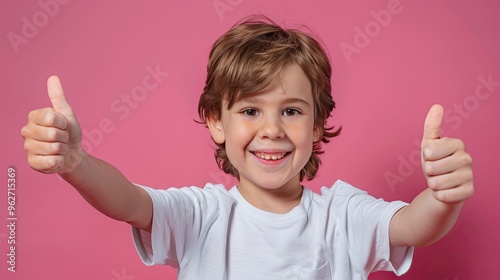 Smiling young boy giving thumbs up, on a solid color background.