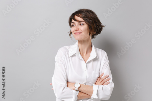 Smiling young business woman in white shirt posing isolated on grey background studio portrait. Achievement career wealth business concept. Mock up copy space. Holding hands crossed, looking aside.