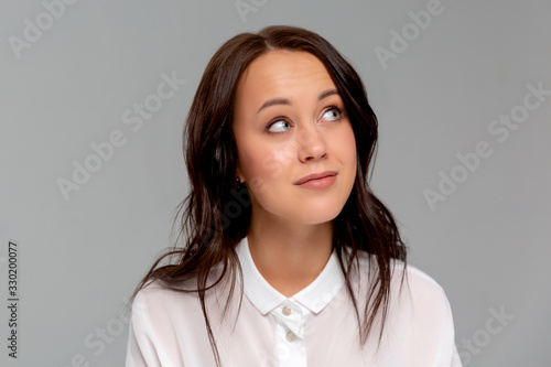 Smiling young business woman in white shirt posing isolated on grey wall background studio portrait. Achievement career wealth business concept. Mock up copy space.