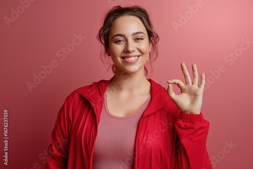 Smiling young caucasian female in red jacket against pink background showing ok gesture