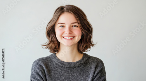 Smiling young caucasian female with short brown hair in gray sweater