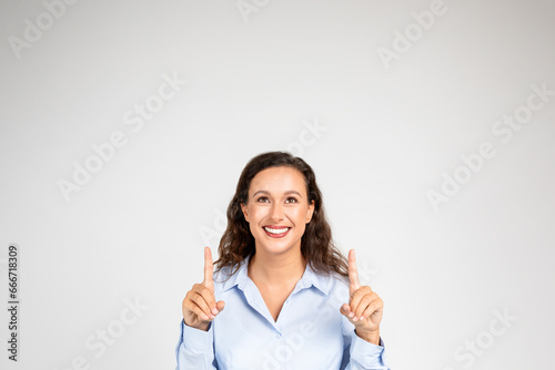 Smiling young european woman in formal wear pointing fingers up at copy space