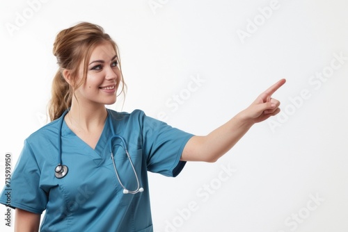 Smiling young female nurse in blue scrubs pointing to the side, indicating direction or choice, with a friendly demeanor.
