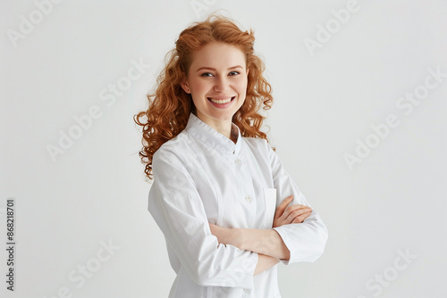 Smiling young ginger professional business woman wearing business smart casual clothes posing isolated on white wall background with copy space
