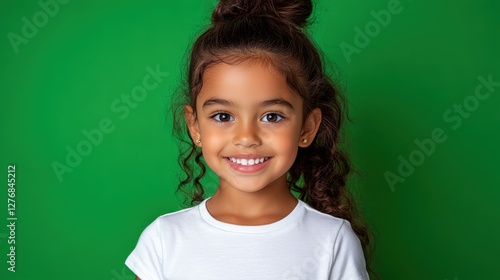 Smiling young girl showing healthy looking directly at the camera with a high ponytail. Isolated on a green background.