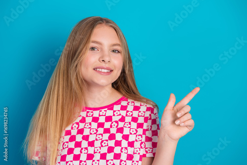 Smiling young girl with a checkered t-shirt pointing at blank blue background showing gesture, isolated studio shot