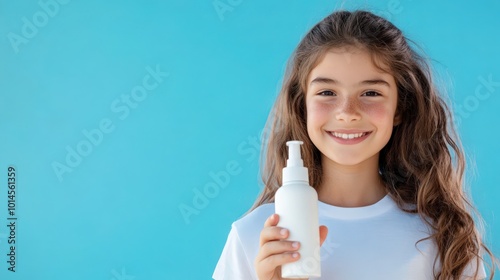 Smiling young girl with a neutral shampoo bottle and hair conditioner in hand on a sky blue backdrop, embodying a moisturizing spa bodycare theme