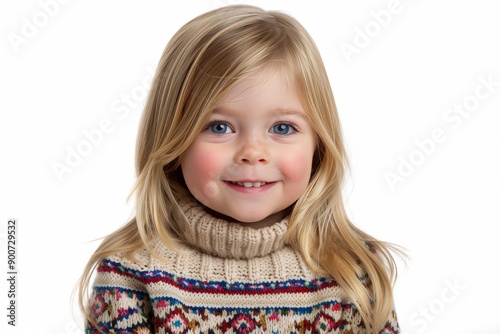 Smiling young girl with blond hair, wearing a sweater, indoor setting, cheerful and cozy, natural light, child portrait, bright and lively, soft lighting, clear and detailed.