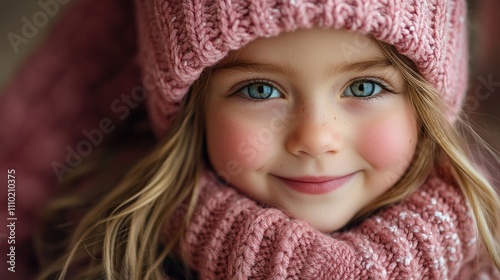 Smiling young girl with blue eyes wearing a cozy pink knitted hat and scarf during winter season portrait close up
