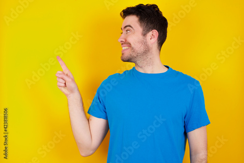 Smiling young handsome caucasian man wearing blue t-shirt against yellow background indicating finger empty space showing best low prices