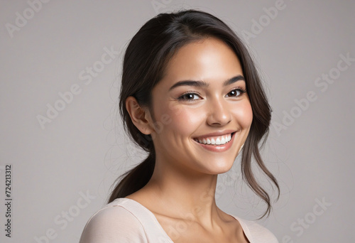Smiling young hispanic attractive woman looking away. Generative AI