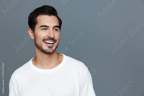 Smiling young man wearing a casual white t-shirt looks camera with a charming smile on a simple solid grey background, showcasing a friendly lifestyle concept.