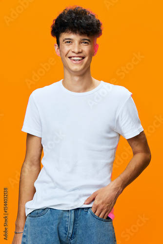 smiling young man wearing white t-shirt and blue jeans stands against bright orange background looking happy and casual with curly hair and relaxed posture