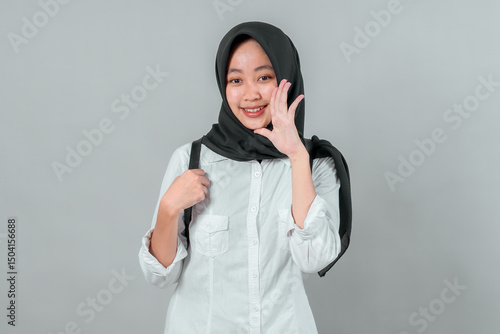 Smiling young Muslim student wearing a black hijab and white shirt with a backpack, making a cheerful hand gesture, ready to go back to school with excitement.