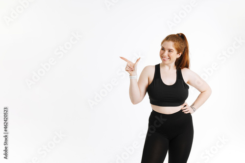 Smiling young plus size fitness woman in sportswear