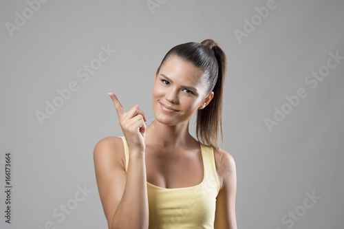 Smiling young sporty woman in yellow tank top scolding finger and looking at camera over gray studio background.