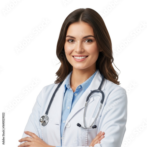 Smiling young woman doctor wearing white lab coat and stethoscope with arms crossed isolated on transparent background
