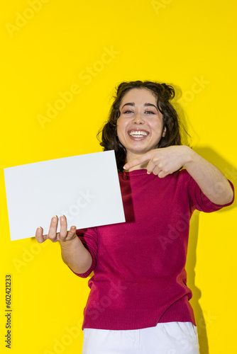 Smiling young woman holding and pointing at a post. Smiling girl holding and pointing to a blank poster