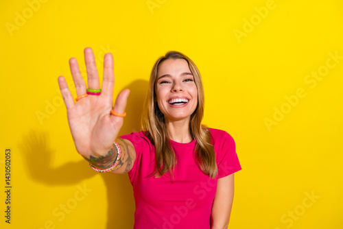 Smiling young woman in a pink t-shirt making a cheerful hand gesture against a bright yellow background