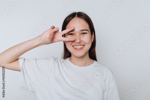 Smiling young woman in a white t-shirt making a peace sign with her fingers.