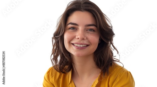Smiling young woman in a yellow blouse, portrait on an isolated white background
