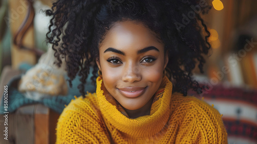 Smiling young woman in a yellow sweater with curly hair. Emotions of happiness and peace of mind
