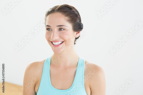 Smiling young woman in blue sports bra