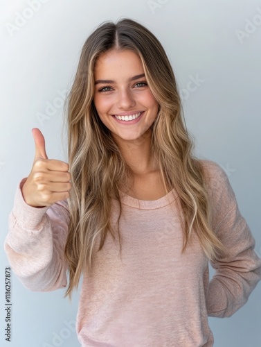 Smiling young woman in casual pink sweater giving thumbs up gesture with light gray background and ample space for text in vertical composition
