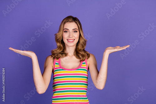 Smiling Young Woman in Colorful Striped Top Gesturing With Open Hands Against Purple Background