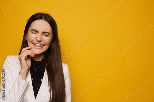 Smiling young woman in dental braces posing with closed eyes at the yellow background, isolated. Latino brunette closing eyes and showing her teeth with stomatology braces. Copy space on the right