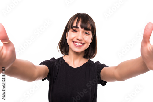 Smiling young woman in glasses casualy dressed taking a selfie with outsretched hands standing isolated over white background