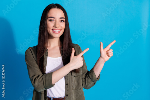Smiling young woman making pointing gestures on blue background showcasing casual fashion and lifestyle.
