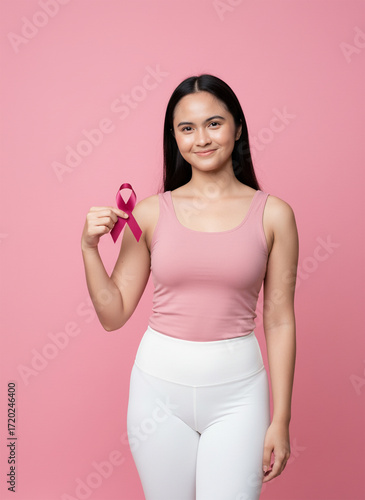 Smiling young woman promotes breast cancer awareness with symbolic pink ribbon, radiating hope and strength during October campaign season