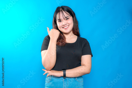 Smiling young woman showing a thumbs-up gesture, expressing positivity and confidence. Friendly facial expression, perfect for advertising, business, and marketing. Casual outfit, blue background.