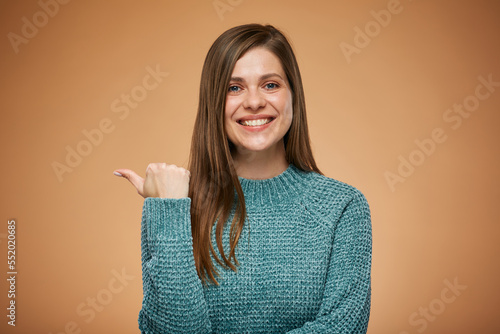Smiling young woman showing thumb up. Isolated advertising portrait.
