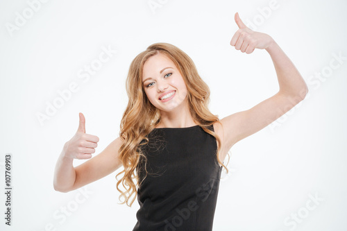 Smiling young woman showing thumbs up