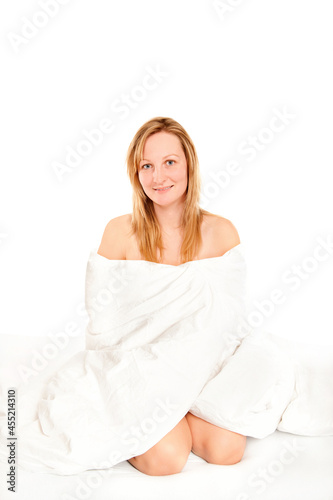 Smiling young woman sitting on her bed covering herself with bedclothes, isolated on white background