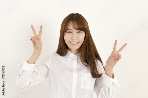 Smiling Young Woman Two Finger Peace Sign Hand Gesture