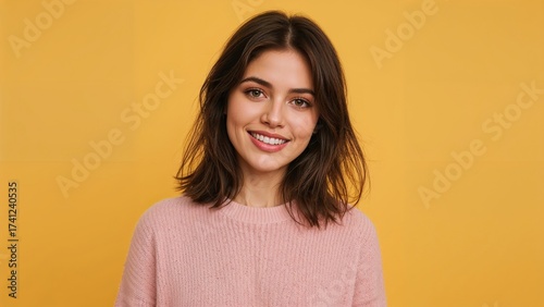Smiling young woman wearing a light pink sweater poses on a vibrant yellow background showcasing a cheerful expression and modern hairstyle