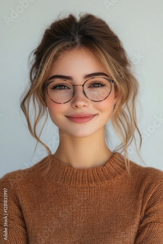 Smiling young woman wearing stylish round glasses and brown sweater