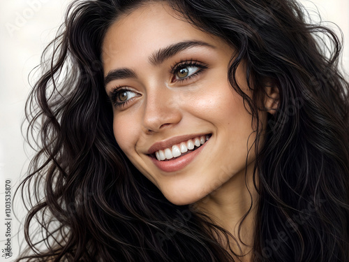 Smiling young woman with curly hair radiates warmth and joy against a light background in a close-up shot focusing on her expressive features